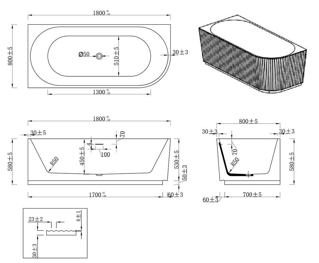 Rivi hoekbad links 180 x 80 cm acryl mat wit met waste mat wit