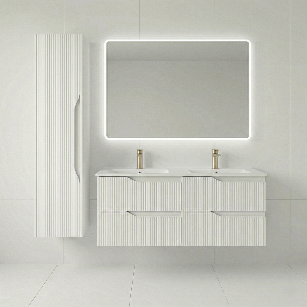 De basis is uitgevoerd in mat wit met het kenmerkende Soho-reliëf. De verticale ribbels geven het meubel een moderne en luxe uitstraling. Bovenop ligt een brede keramische dubbele wastafel. Dit oogt niet alleen strak en naadloos, maar is ook heel praktisch: keramiek is krasvast, hygiënisch en met een doekje zo weer schoon.