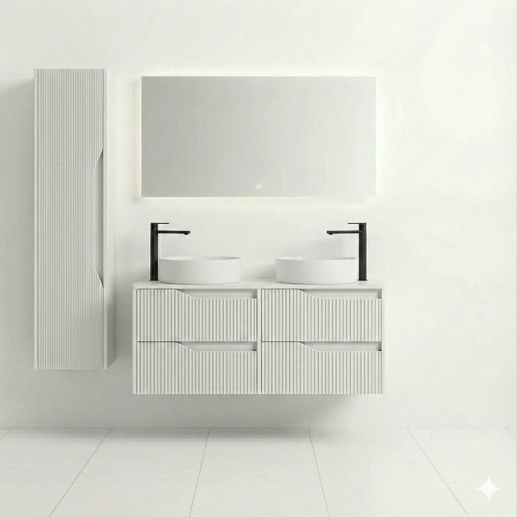 Het meubel van 120 cm breed is voorzien van het kenmerkende Soho-design met verticale ribbels. Dit reliëf geeft het strakke wit net dat beetje extra diepte en luxe, zonder de rust te verstoren. Op het naadloze afdekblad staan twee elegante opbouwkommen, waardoor je 's ochtends nooit meer op elkaar hoeft te wachten.