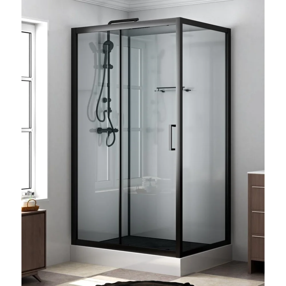 De mat zwarte aluminium profielen zorgen voor een strak en eigentijds design. Net als de profielen zijn alle onderdelen van deze douche mat zwart afgewerkt. De achterwanden van de douche zijn gemaakt van wit veiligheidsglas en de schuifdeur van 6 mm dik, sluit met een elegant zwart magneetprofiel. De designgreep geeft deze douche een ultramoderne uitstraling.