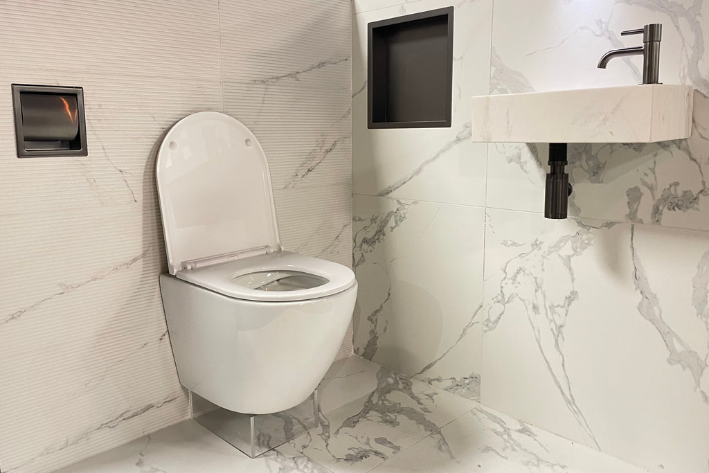 Deze fonteinset maakt indruk met zijn stoere combinatie van Carrara natuursteen en gun metal kraan. Het industriële zwart staat prachtig tegen het witte marmer. Een gewaagde mix die je toilet net dat beetje extra geeft.