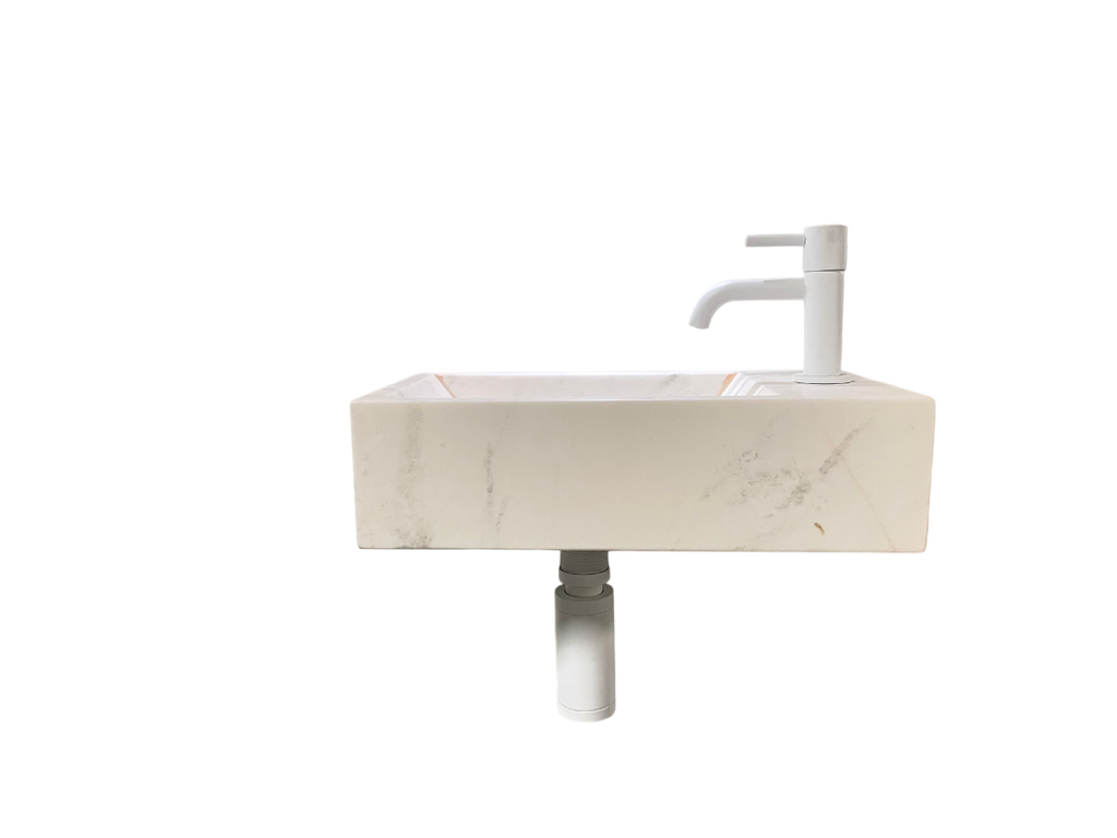 Je krijgt: - Carrara natuursteen fontein - Mat witte design kraan - Bijpassende sifon - Montageset - Montagehandleiding