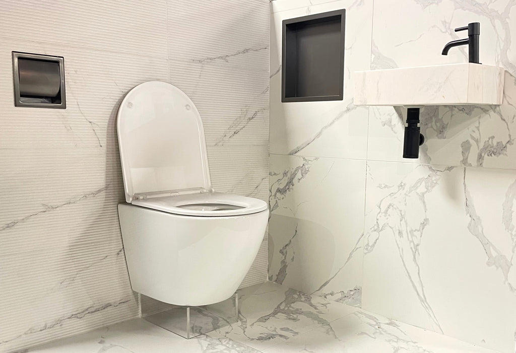 Deze strakke fonteinset brengt het beste van twee werelden samen: klassiek Carrara natuursteen en een moderne mat zwarte kraan. Het minimalistische ontwerp maakt een krachtige indruk in je toilet.