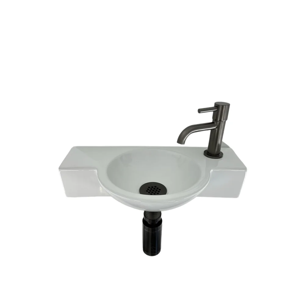 De meegeleverde kraan in Gun metal afwerking vormt een stijlvol contrast met de witte waskom. Met één kraangat past deze kraan perfect bij de fonteinset en creëert het een moderne uitstraling in jouw toilet.