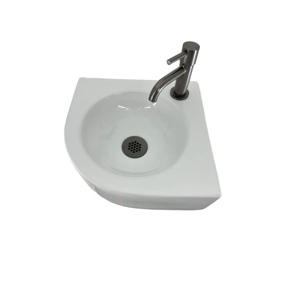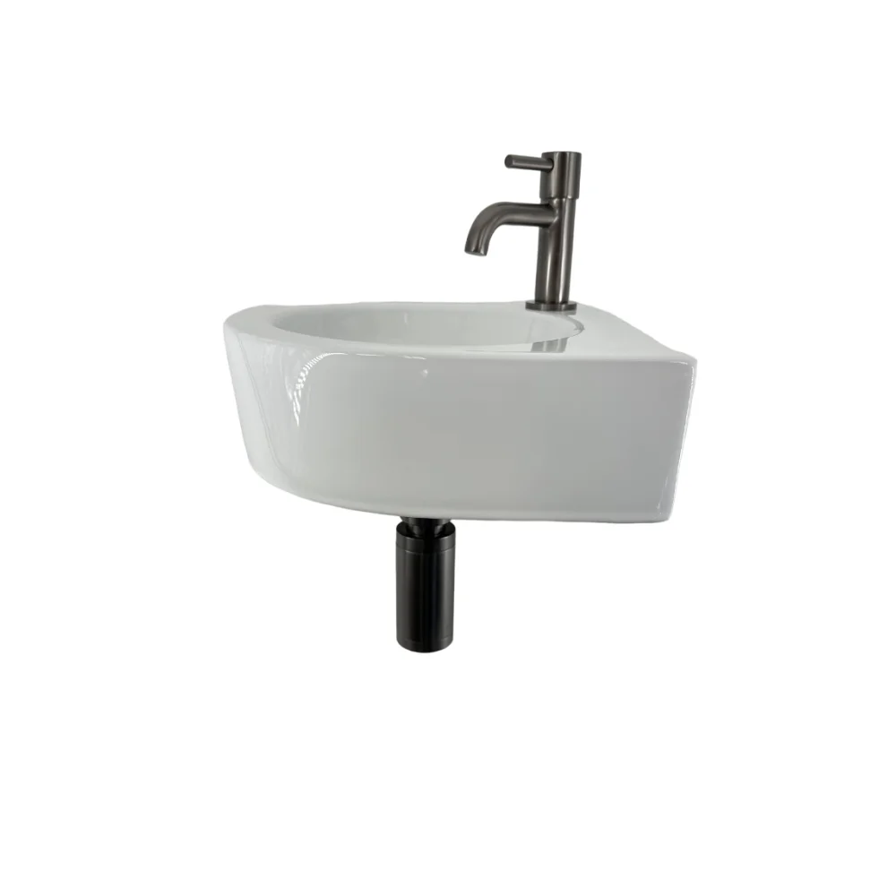 Geef jouw toiletruimte een stijlvolle upgrade met de Fonteinset Lotte L'aqua. Deze complete set bestaat uit een kwartrondevormige wastafel vervaardigd uit glanzend wit keramiek, een Gun metal kraan en een bijpassende sifon.