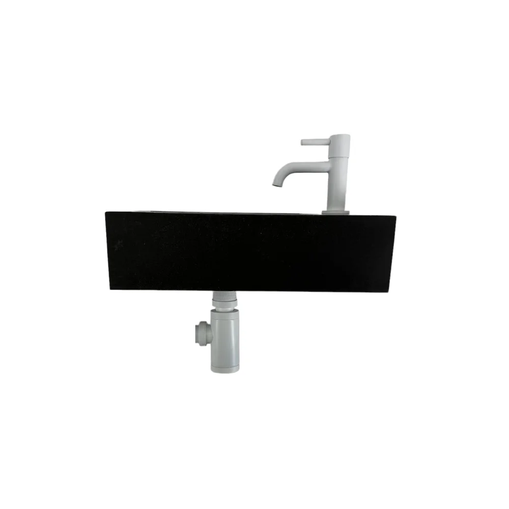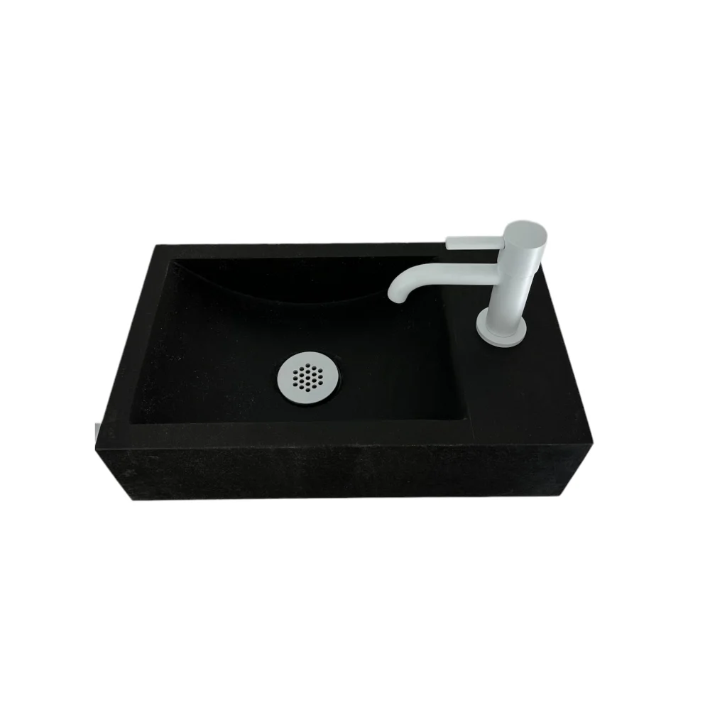 De rechthoekige vorm en matte afwerking van de wastafel geven deze fonteinset een strakke en moderne look. De bijpassende mat witte kraan vormt een stijlvol contrast met het donkere hardsteen en biedt optimaal gebruiksgemak dankzij de enkele hendel.