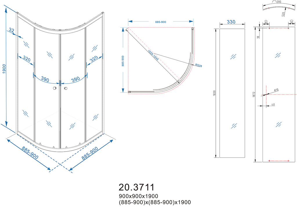 Eco kwartronde cabine met twee schuifdeuren 900 x 900 x 1900 x 5 mm nano helder glas/chroom