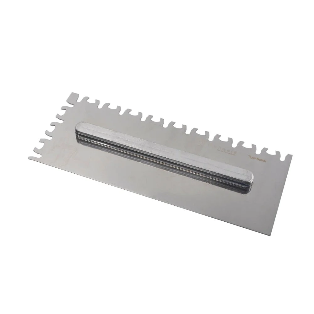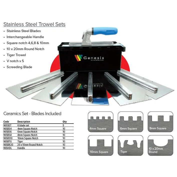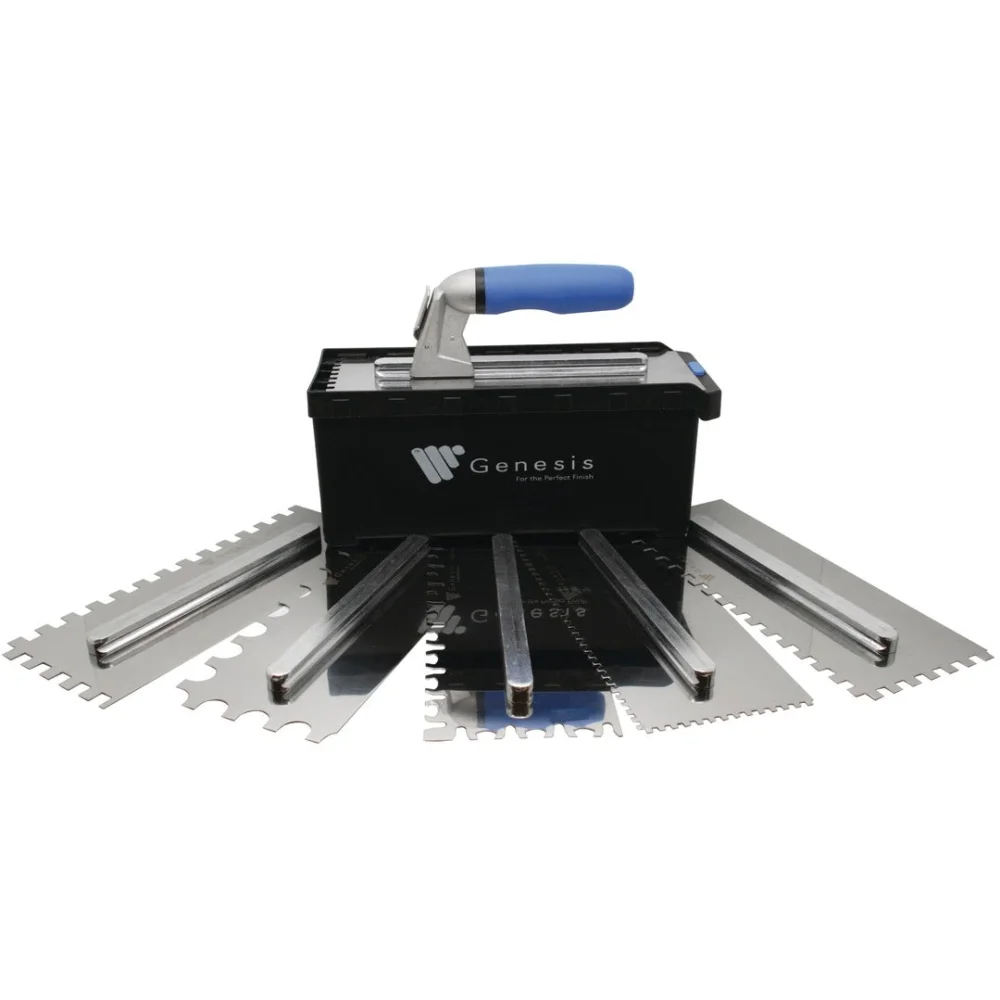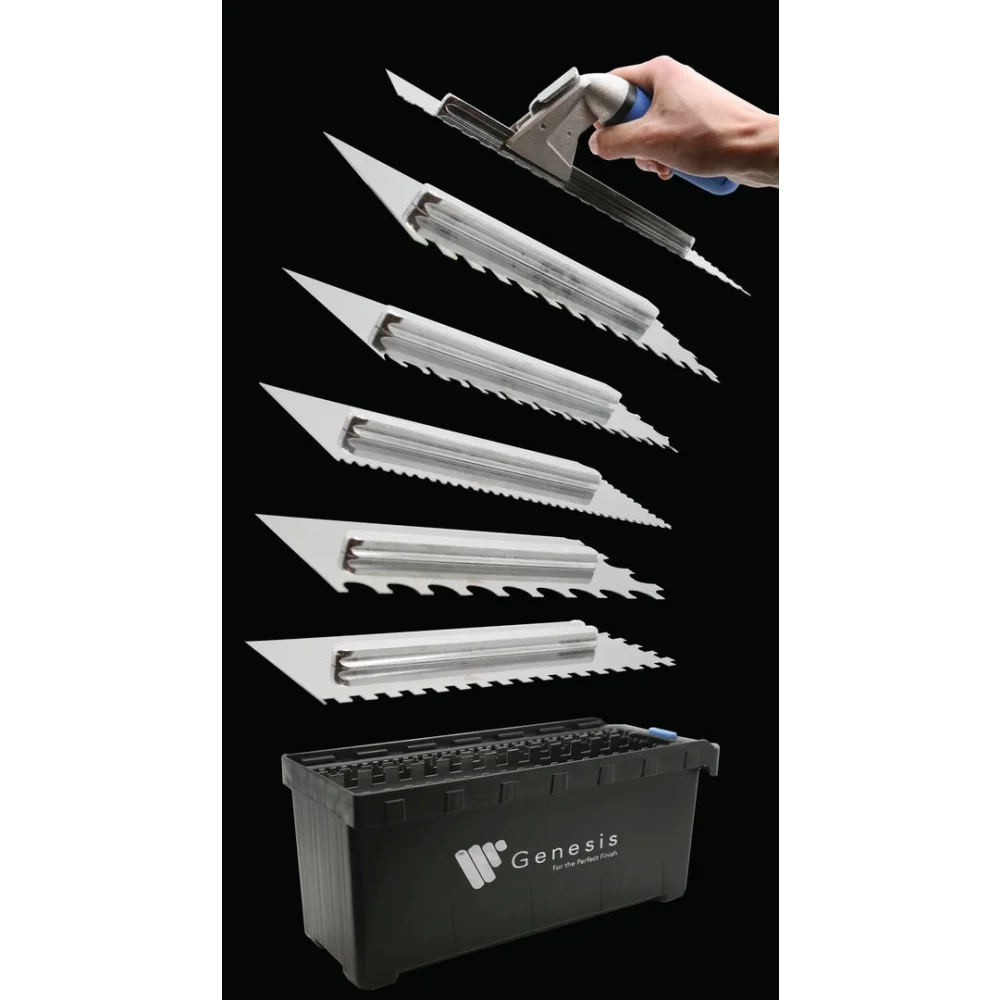 Deze lijmkam set bestaat uit RVS lijmkammen met een vertanding van 4 mm, 6 mm, 8 mm, 10 mm, 10x20 mm met ronde tanden en de zogenaamde 'Tiger' lijmkam welke een perfect alternatief is voor de 'buttering en floating' methode; waardoor je maar slechts één zijde in hoeft te kammen. De bladen kunnen eenvoudig en snel worden gewisseld door het 'slide & lock' systeem. Het ergonomisch vormgegeven softgrip TPR handvat past op elke lijmkam in deze set. Het handvat is geschikt voor zowel rechts- als linkshandigen, is vochtbestendig, heeft een antislip werking en is licht van gewicht dat wel zo prettig is tijdens de tegelklus.