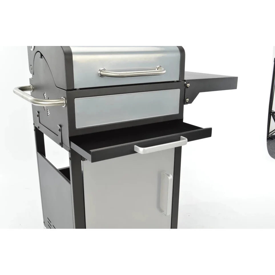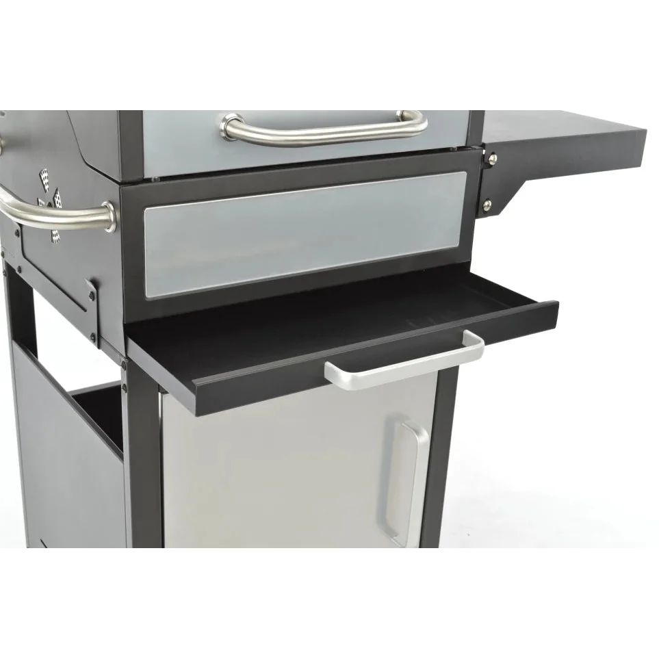 Deze robuuste houtskoolbarbecue combineert professionele grillfuncties met praktisch gebruiksgemak. Met het in hoogte verstelbare houtskoolrooster, gietijzeren grilloppervlak en dubbele wandige deksel met thermometer creëer je perfect gegaarde gerechten. Dankzij de inklapbare zijtafel, warmhoudrooster en vier wielen transformeert deze barbecue je tuin in een volwaardige buitenkeuken.
