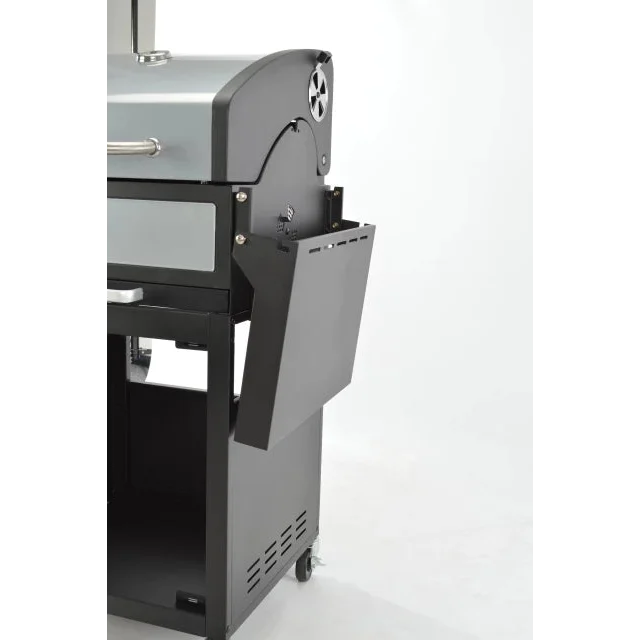 In hoogte verstelbaar houtskoolrooster, thermometer, warmhoudrooster, inklapbare zijtafel, aslade |