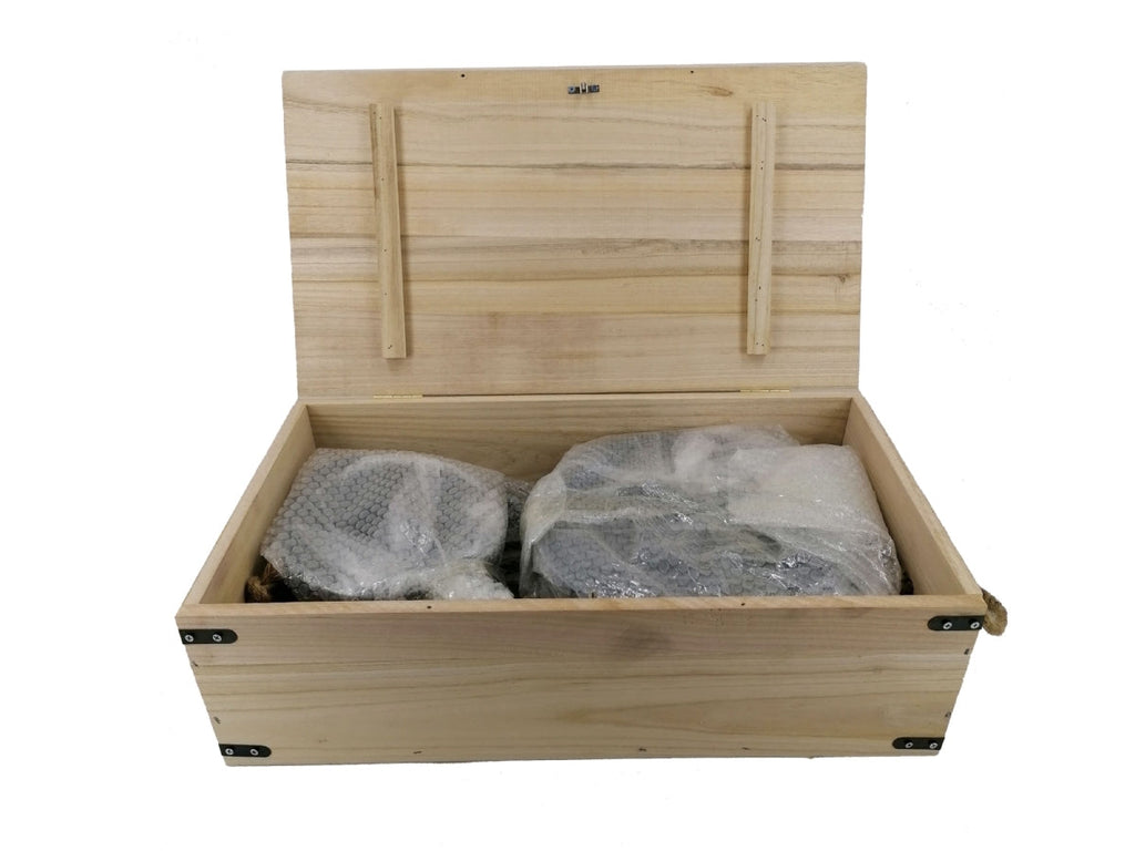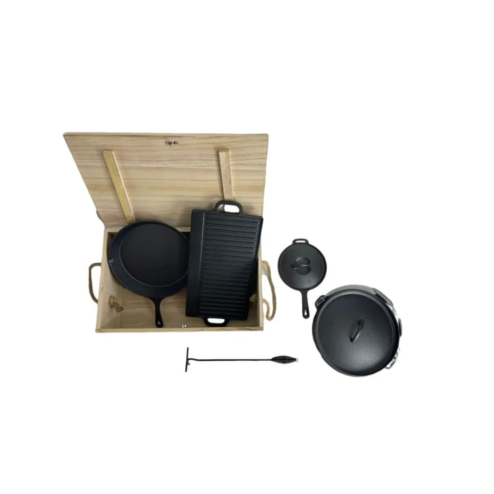 Deze uitgebreide Dutch Oven Set van Landmann bestaat uit een 12 inch Dutch Oven 6 qt (zonder pootjes), een 12 inch Skillet, 8 inch steelpan, dubbelzijdige bakplaat, dekselhouder, deksellifter in hersluitbare houten kist. Met deze set kun je op de barbecue, maar ook thuis op het gasfornuis heerlijk eten bereiden. Omdat de pannen geen pootjes hebben, ook te gebruiken op een gasfornuis, inductieplaat, elektrische oven en keramische warmtebronnen. Outdoors ook perfect mee koken op open vuur. En door het speciale handvat blijft de Dutch Oven perfect hangen aan een ketting of haak in een driepoot.