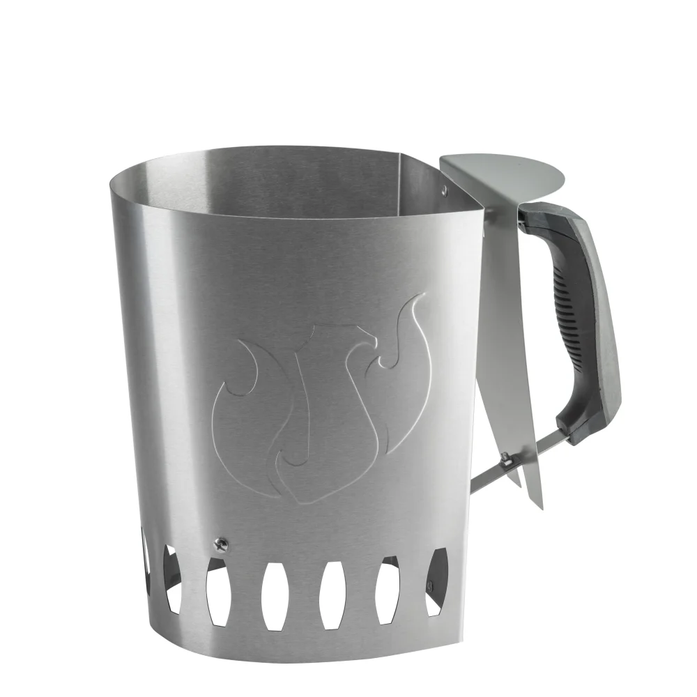 De Landmann GrillChef schoorsteenstarter ontsteekt zowel briketten als houtskool gelijkmatig zonder dat u een vloeibare aansteker op petroleumbasis hoeft te gebruiken. De schoorsteenstarter is eigenlijk een rechtopstaande metalen cilinder met een diameter van 18 cm en een hoogte van 28 cm, voorzien van een houten handvat met een beschermkap tegen het verbranden van je hand en een metalen keerschot aan de onderkant.