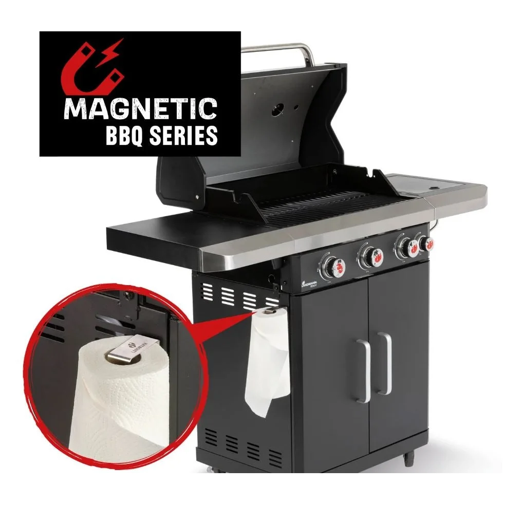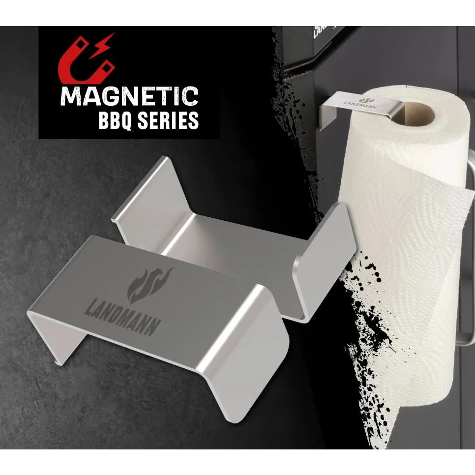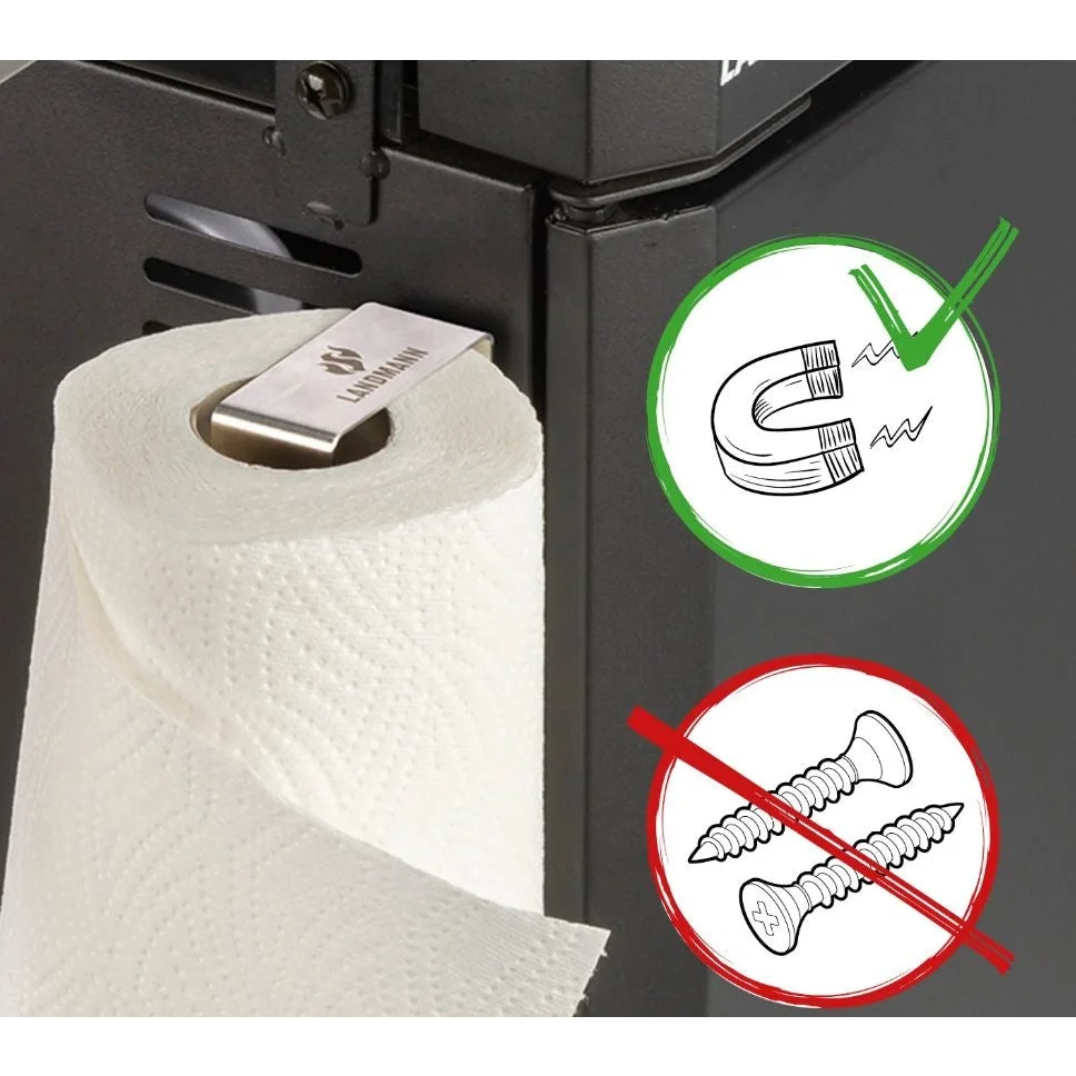 De twee sterke magneten houden niet alleen stevig en betrouwbaar vast op LANDMANN barbecues, maar zijn ook ideaal om bijvoorbeeld aan de koelkast te bevestigen. Het discrete, moderne roestvrijstalen ontwerp van de magnetische keukenrolhouder ziet er overal goed uit, zowel in de keuken als in de tuin.. 100% geschikt voor de Landmann Rexon en Triton modellen.