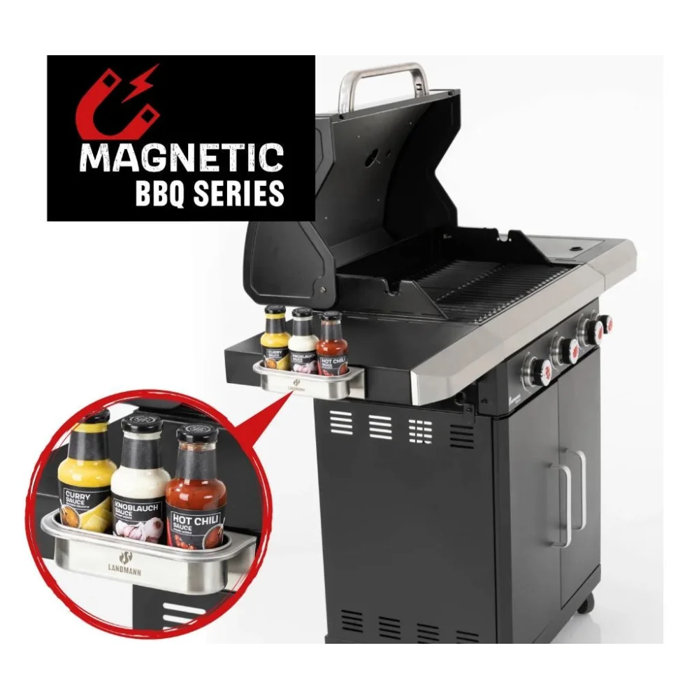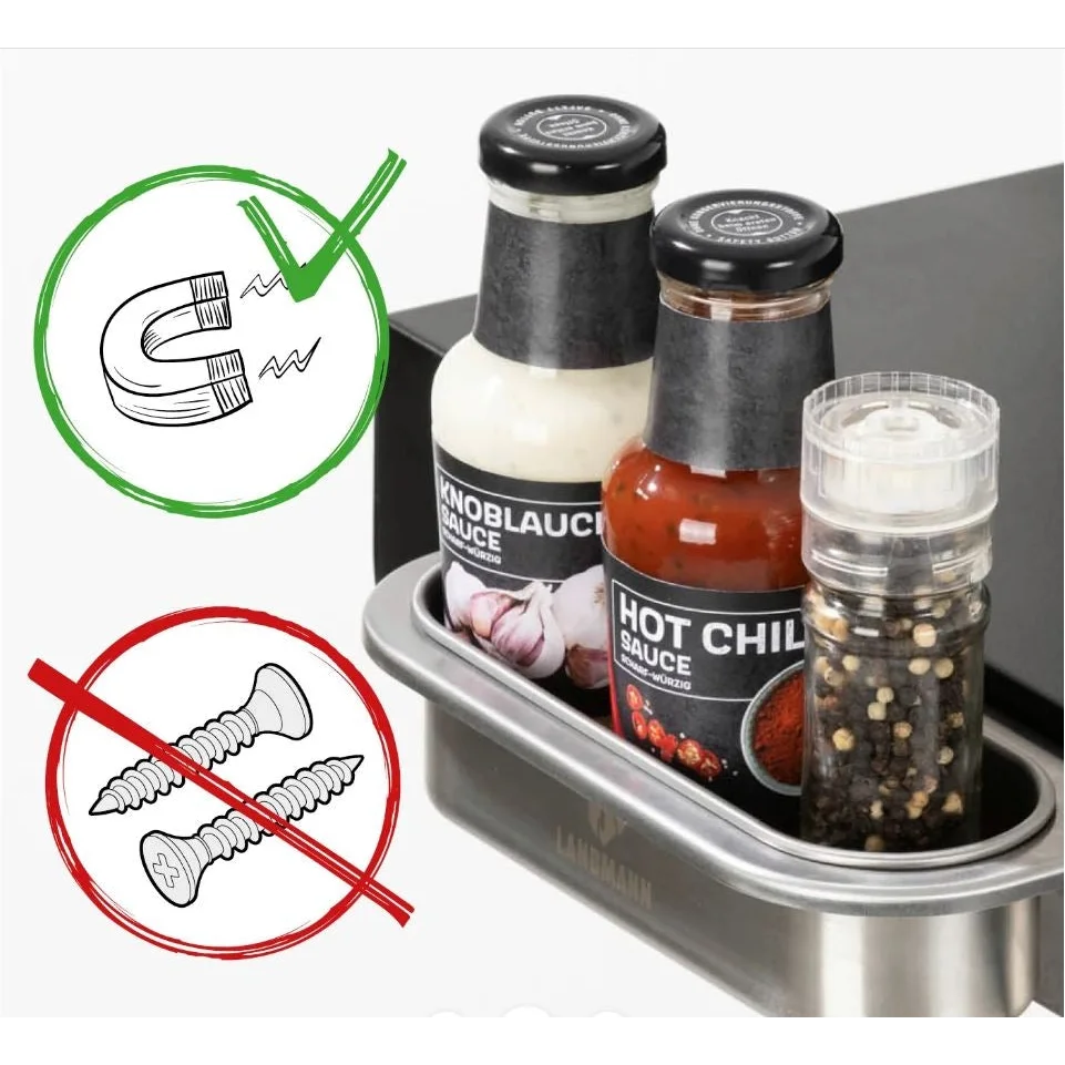 De magnetische sausfleshouder voor de barbecue van LANDMANN biedt voldoende ruimte voor uw favoriete sauzen en die van uw gasten. Zo heb je tijdens de barbecue alles bij de hand en kun je direct de gewenste fles saus gebruiken in plaats van lang te moeten zoeken.
