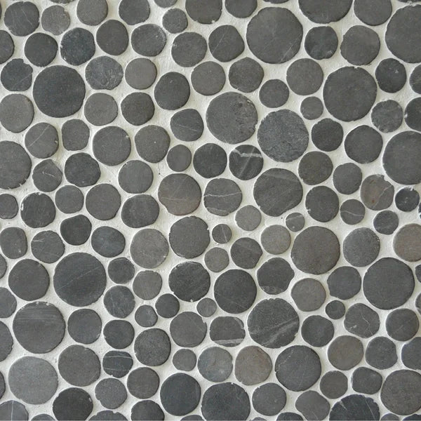 Natuursteenmozaïek Coinstone in donkergrijs met een afmeting van 29,4 x 29,4 cm is perfect voor het creëren van een unieke en stijlvolle uitstraling in je badkamer, keuken of andere ruimtes. Dit mozaïektegel is gemaakt van hoogwaardig natuursteen en heeft een prachtige matte afwerking.