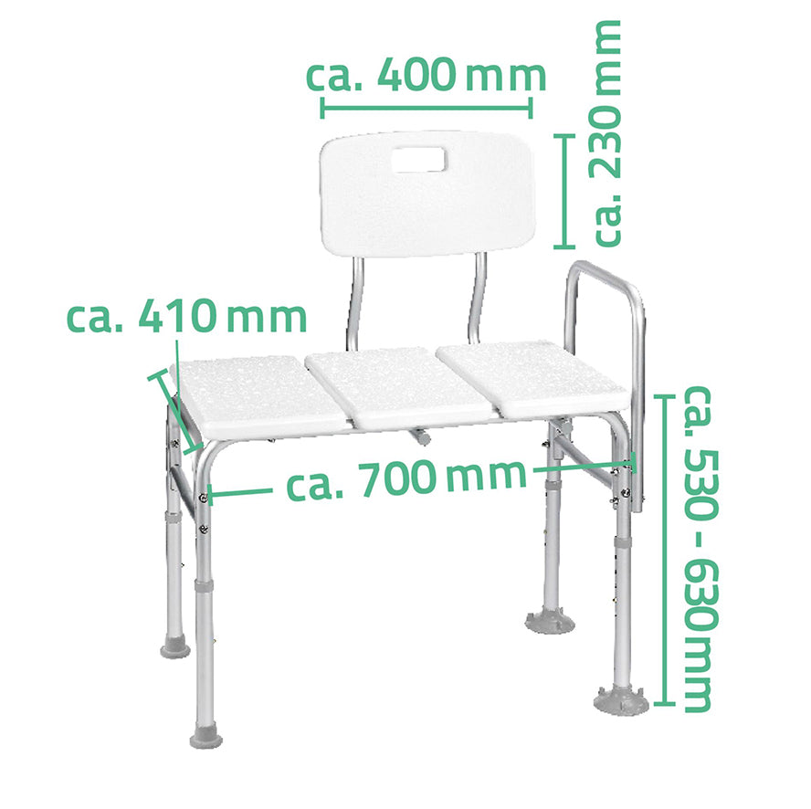 Blijf uw badkuip zelfstandig en veilig gebruiken met deze transferbank van RIDDER. Dit in hoogte verstelbare mobiliteitshulpmiddel heeft een royaal zitoppervlak van 70 x 41 cm (B x D), waardoor u gemakkelijk in en uit bad kunt stappen. Plaats hem over de rand van uw badkuip, houd de hendel aan de linkerkant vast en schuif over de zitting naar het midden van de badkuip. De rugleuning kan aan beide zijden bevestigd worden waardoor dit hulpmiddel van beide zijden gebruikt kan worden. Het frame van de steunbank is gemaakt van duurzaam, roestbestendig aluminium en de zitting is gemaakt van onderhoudsvrij hogedichtheidpolyethyleen en is voorzien van afvoergaten voor een snelle droging. De grote antislipvoetjes zorgen ervoor dat de bank stevig op zijn plek blijft staan, ook op natte vloeren. Kenmerken Kleur: wit Materiaal: aluminium en kunststof Afmetingen: 70 x 49 x 102 cm (L x B x H) Afmetingen zitting: 70 x 41 cm (B x D) Afmetingen rugleuning: 40 x 23 cm (L x B) Rugleuning kan kan aan de andere kant worden bevestigd Zithoogte verstelbaar van 53 tot 63 cm Grote antislipvoeten Staat stevig in de badkuip dankzij voeten met zuignappen Geïntegreerde afvoergaten voor snel drogen Maximaal gebruikersgewicht: 150 kg Inclusief montagemateriaal en montagehandleiding.