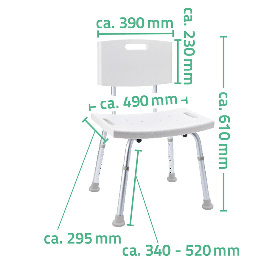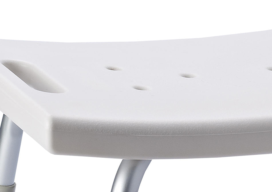 De badkamerstoel is verstelbaar en heeft een stevig roestbestendig aluminium frame. De stoel is ergonomisch ontworpen en heeft een draagvermogen van maximaal 150 kg.