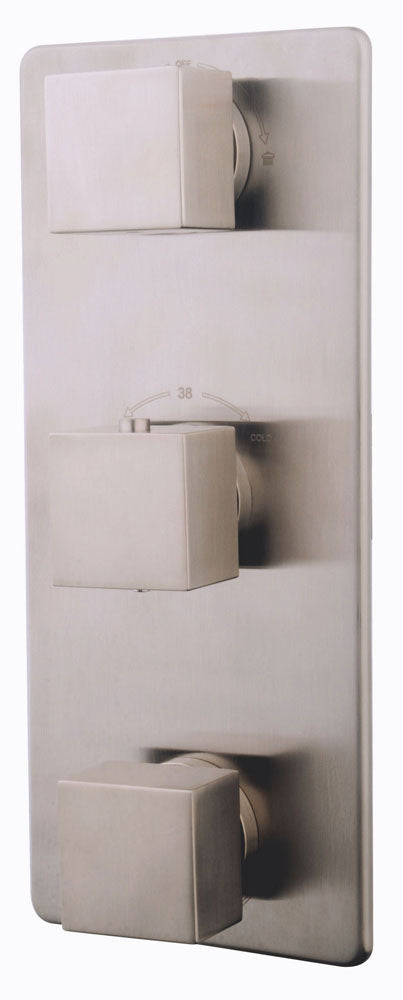 Deze afbouwset met vierkante knoppen heeft een volledige finish van geborsteld staan. De Rombo inbouw douchekraan afbouwset 3-weg RVS look van Wiesbaden Sanitair bestaat uit: