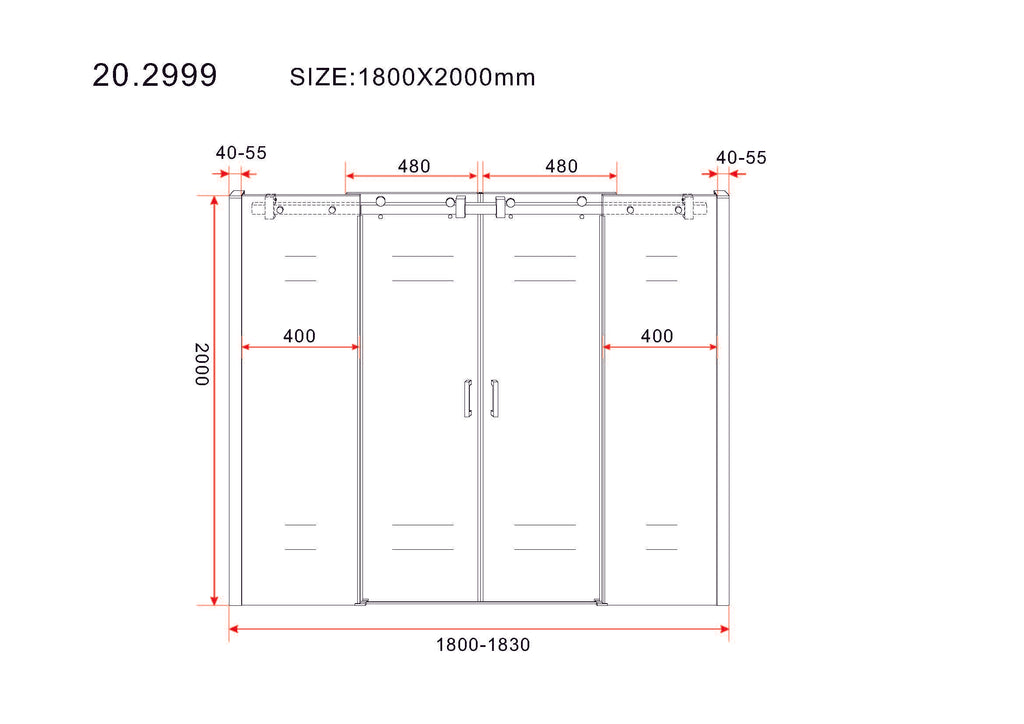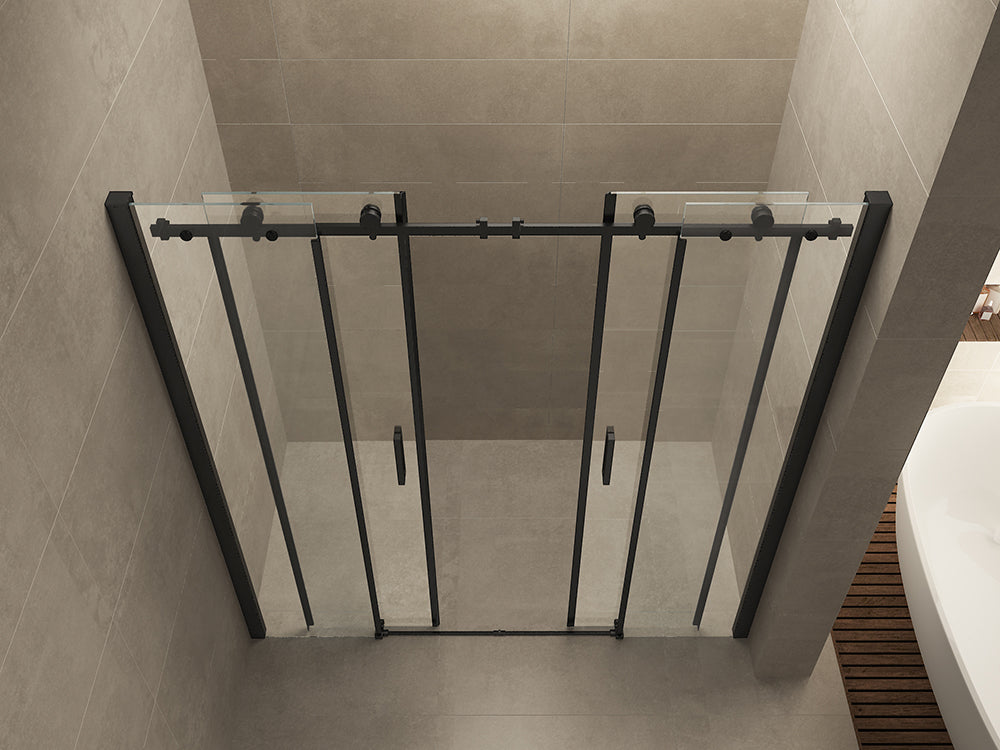 Zeer fraaie dubbele douchedeur in nis met twee zijwanden. 180cm breed 200cm hoog. Glas 8mm dik met NANO