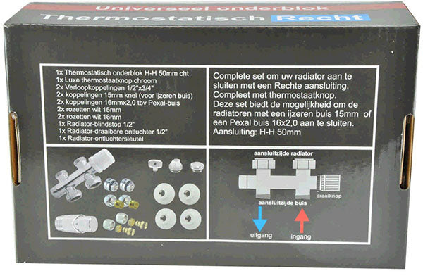 Complete set om een radiator met een midden-onder aansluiting aan te sluiten. Geschikt voor zowel 15mm knel of 16mm Pexal kunststof buis.