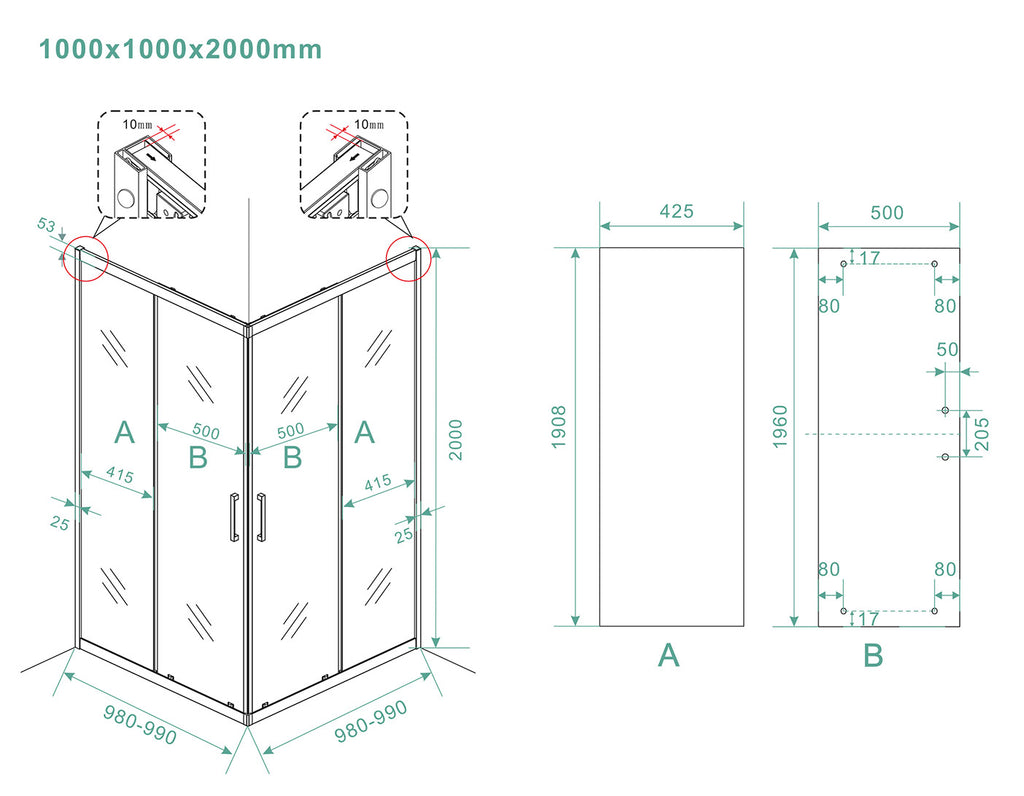Skyline hoekinstap + 2 schuifdeuren 1000x1000x2000 mat zwart 8mm NANO