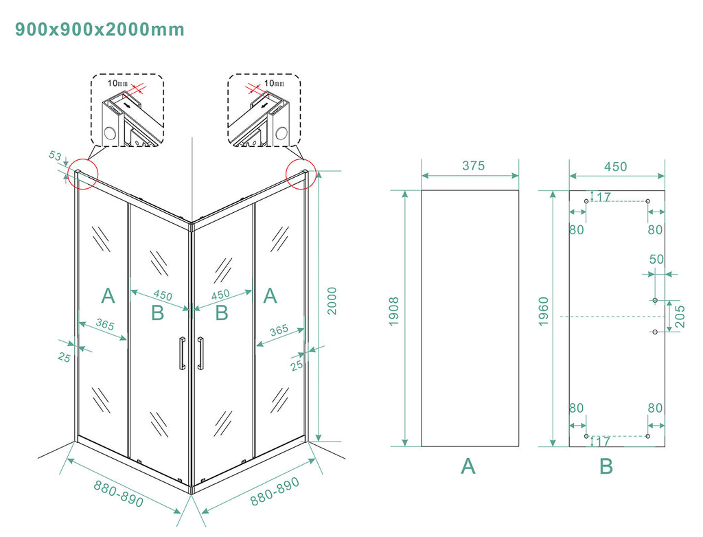 Skyline hoekinstap + 2 schuifdeuren 900x900x2000 mat zwart 8mm NANO