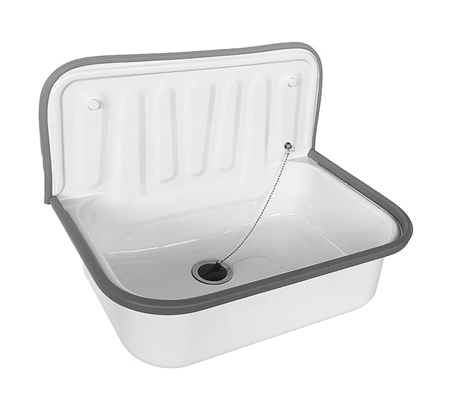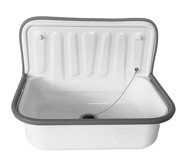 Uitstortgootsteen plaatstaal 50,5 x 33 x 37 cm glans witInclusief stootrand en afvoerstop met ketting.