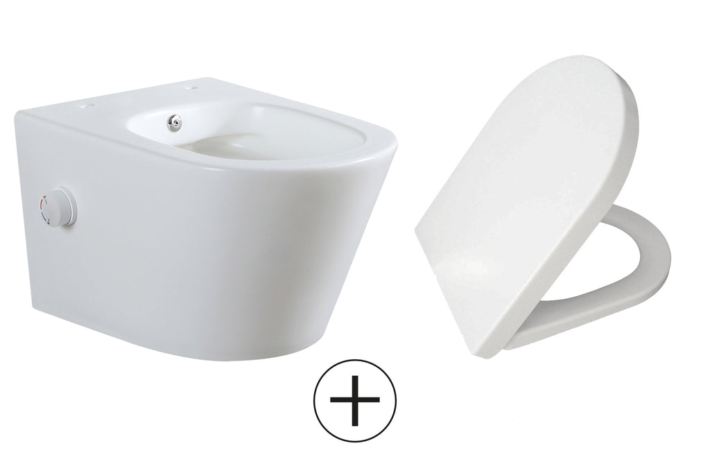 Vesta wandcloset rimless met bidetkraan warm koud water met Vesta toiletzitting mat wit