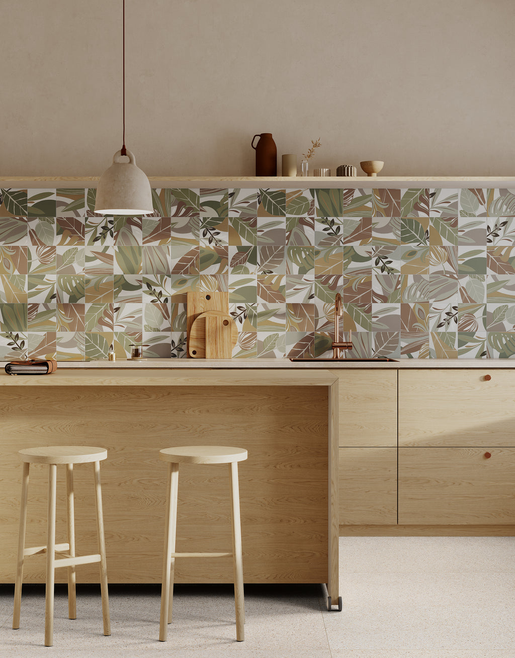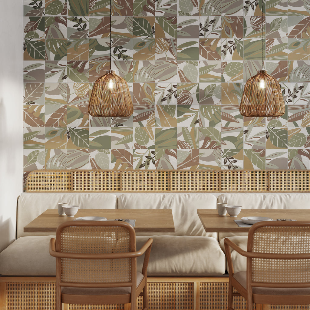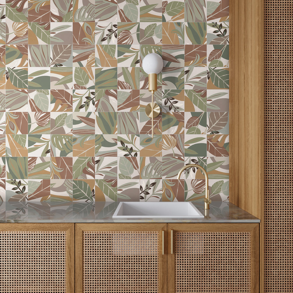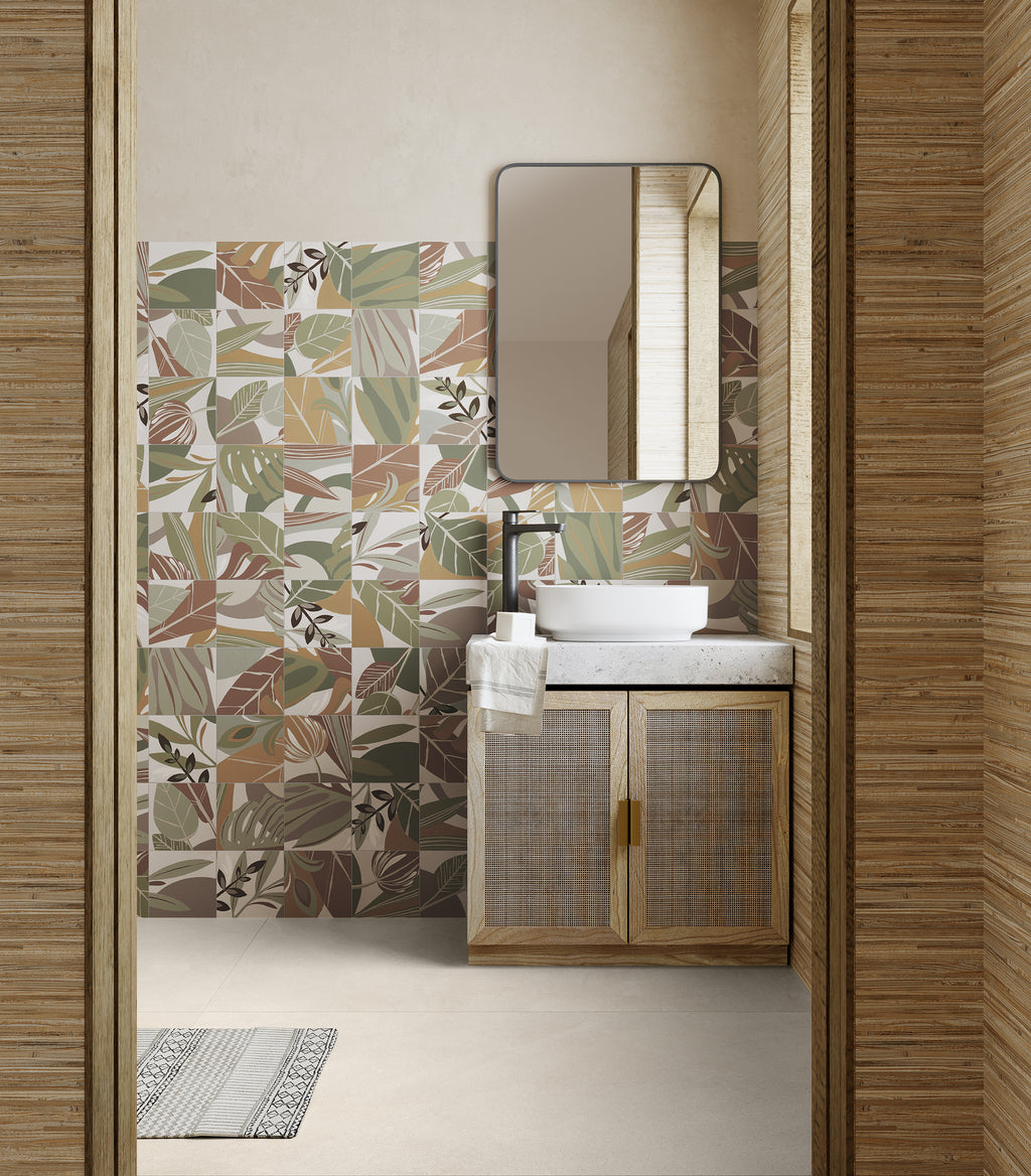 De Habana Natural collectie kenmerkt zich door een organisch patroon van bladeren en natuurlijke vormen in warme natuurtinten. Elke tegel heeft een uniek ontwerp, wat zorgt voor een levendig en gevarieerd oppervlak zonder onrustig te worden. Het matte oppervlak versterkt de natuurlijke uitstraling.