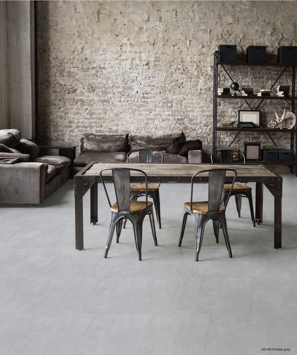Breng een neutrale rust in jouw ruimte met deze sfeervolle grijze vloertegel uit de Oasis collectie. De tegel heeft een subtiele betonlook die perfect past binnen een minimalistisch of industrieel interieur.