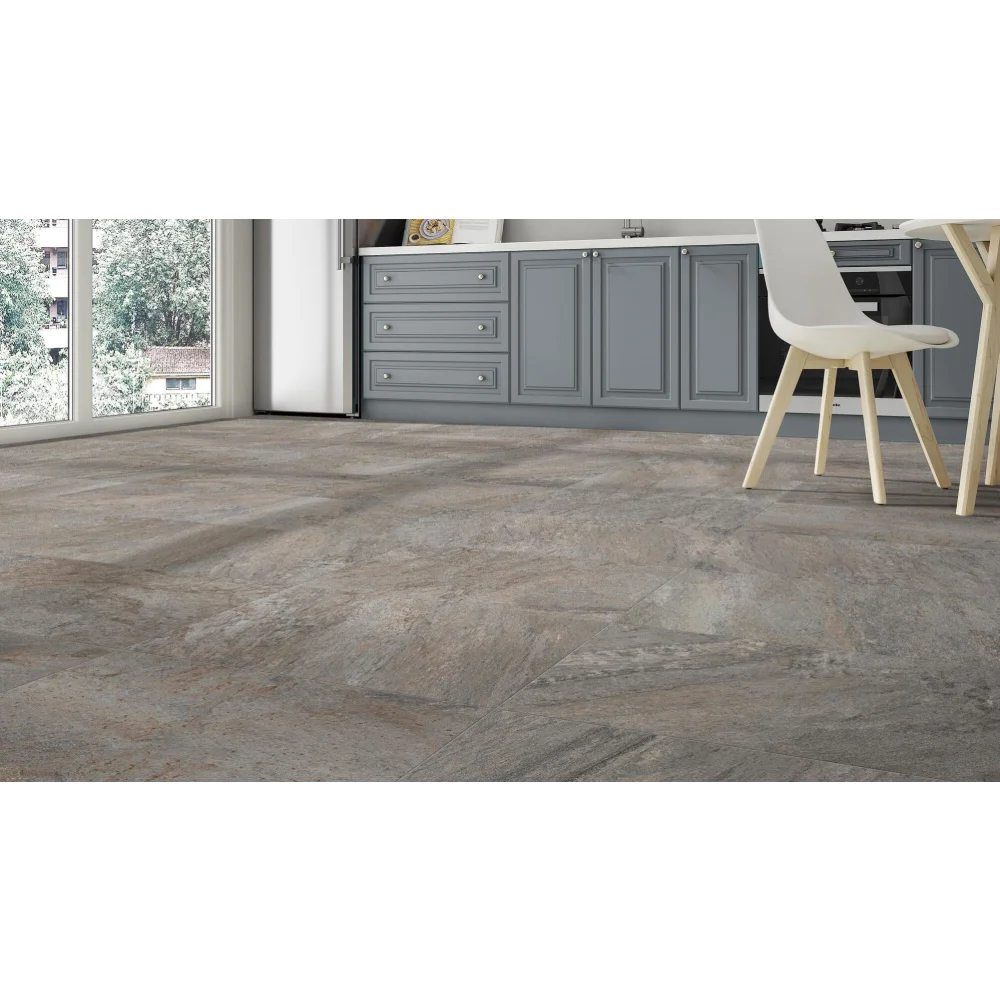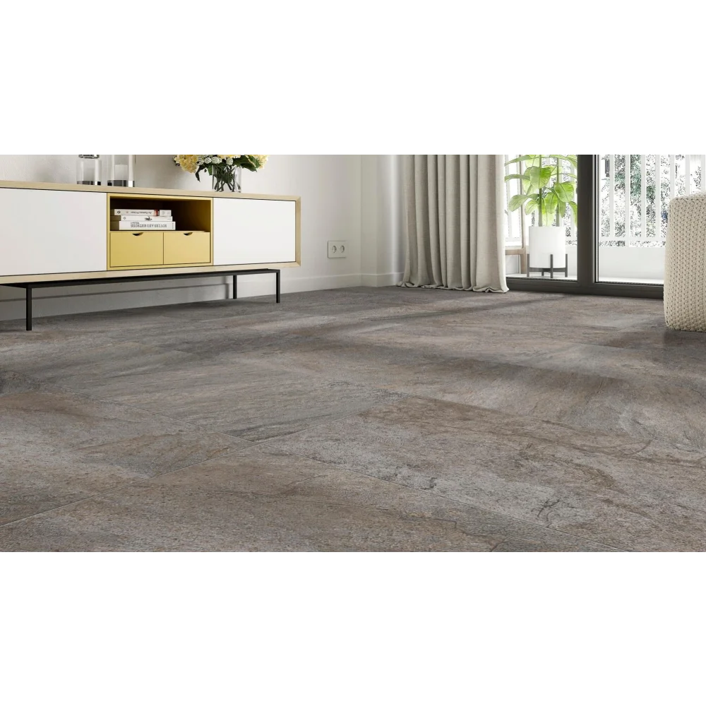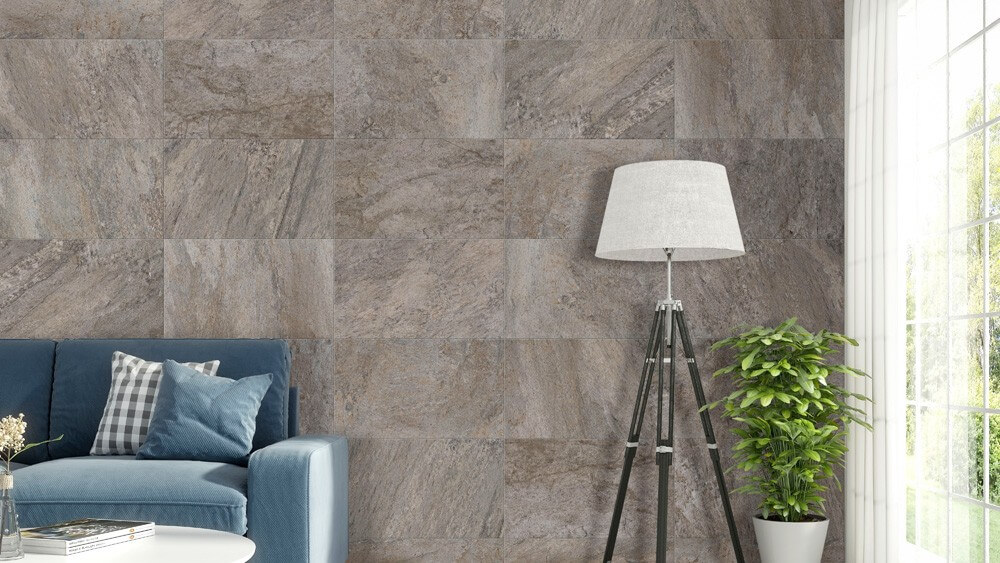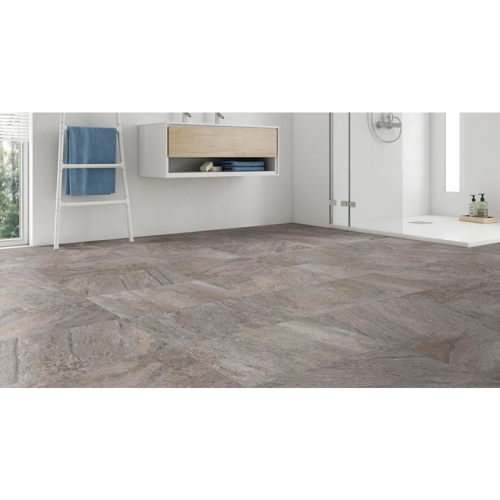 Deze grijze tegel werkt perfect met natuurlijke materialen zoals hout en textiel. Combineer hem met blauwe of groene accenten voor een fris uiterlijk, of met aardtinten voor een kalme, geaarde sfeer. Ook kan de tegel prachtig gecombineerd worden met andere kleuren uit de Quarzite-collectie, zoals Arena (zand) of Blanco (wit).