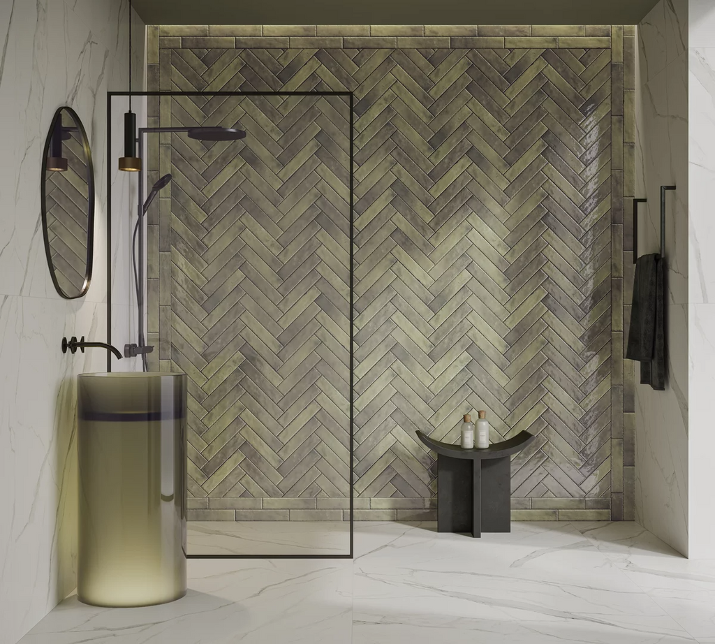 Olijfgroen is de perfecte neutrale kleur die veel verder reikt dan traditionele wandbekleding - deze elegante tegels transformeren elke ruimte tot een oase van rust: