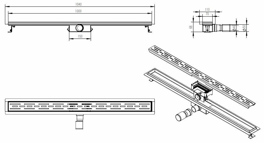 De douchegoot wordt geleverd met een uitneembaar waterslot en haarfilter, waardoor onderhoud een fluitje van een cent is. De meegeleverde verloopmof van 40/50mm en het waterdichte membraan zorgen voor een probleemloze installatie. Dankzij de verstelbare poten kun je de goot perfect waterpas plaatsen.