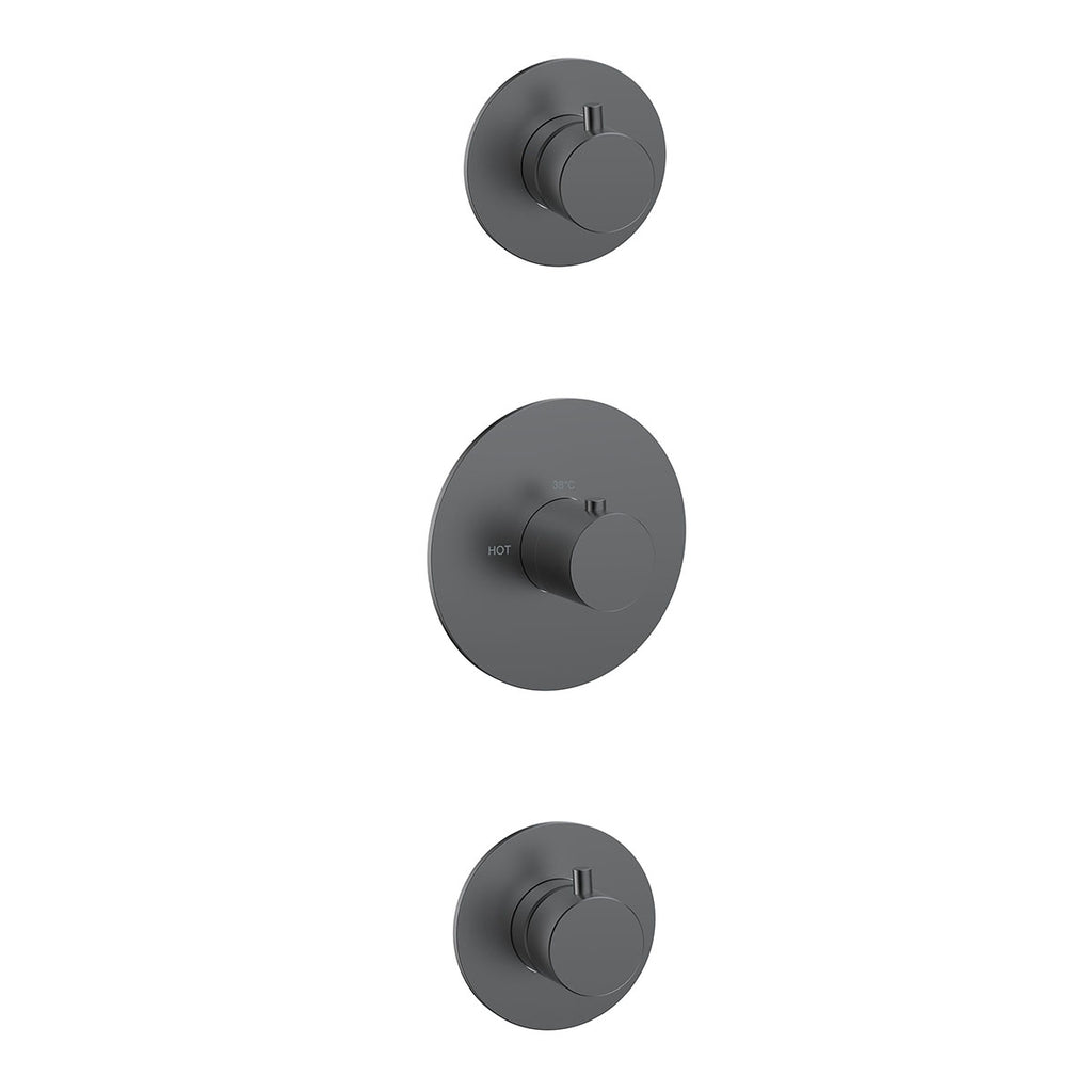 Een inbouwkraan zorgt voor een minimalistische look en feel in de badkamer. Dit afbouwdeel uit de Wiesbaden Dreams collectie in gunmetal is bedoeld voor combinatie met de Wiesbaden Dreams inbouwdeel voor thermostatische douchekraan met 2 stopkranen.