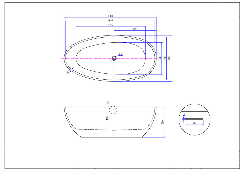 Ellips vrijstaand bad 180 x 90 x 60 cm acryl glans wit met waste glans wit