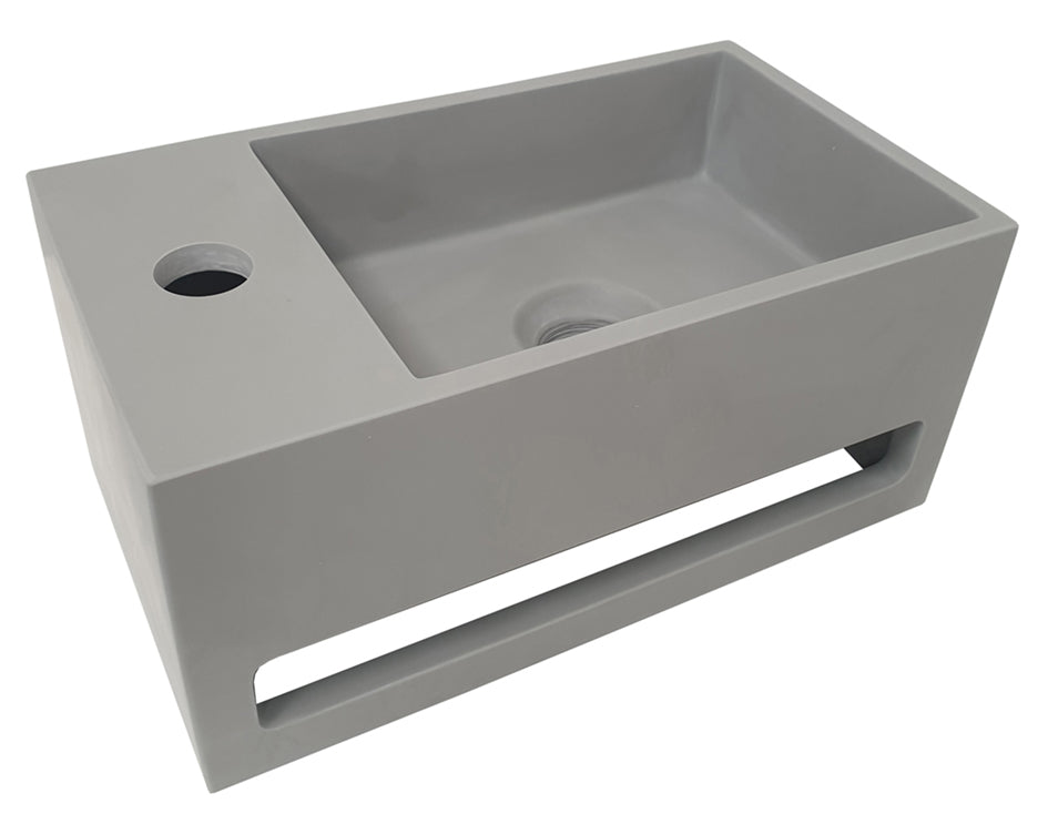 De Wiesbaden Julia fontein links is vervaardigd uit hoogwaardig Solid surface materiaal, bekend om zijn duurzaamheid en onderhoudsgemak. Met zijn betonlook afwerking voegt deze fontein een moderne, industriële touch toe aan je toilet of gastentoilet.
