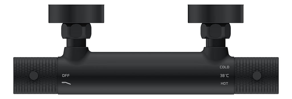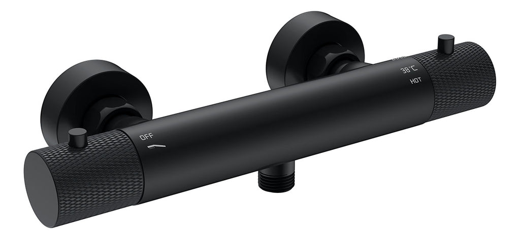 Ontdek de Wiesbaden Ribbd thermostatische douchemengkraan in mat zwart, met een hartafstand van 15 cm.