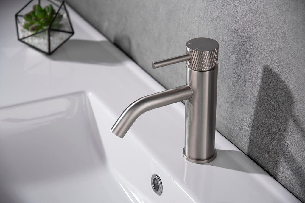 Ontdek de duurzame en stijlvolle Wiesbaden Ribbd wastafelmengkraan in geborsteld staal voor jouw badkamer.